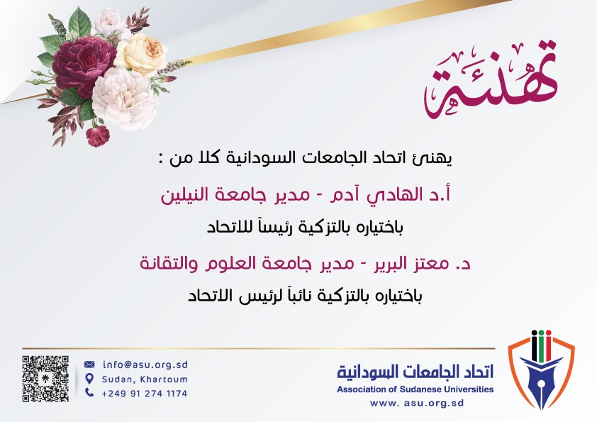 يهنئ اتحاد الجامعات السودانية كلا من : أ.د الهادي آدم - مدير جامعة النيلين باختياره بالتزكية رئيسا للاتحاد و د. معتز البرير - مدير جامعة العلوم والتقانة باختياره بالتزكية نائبالرئيس الاتحاد