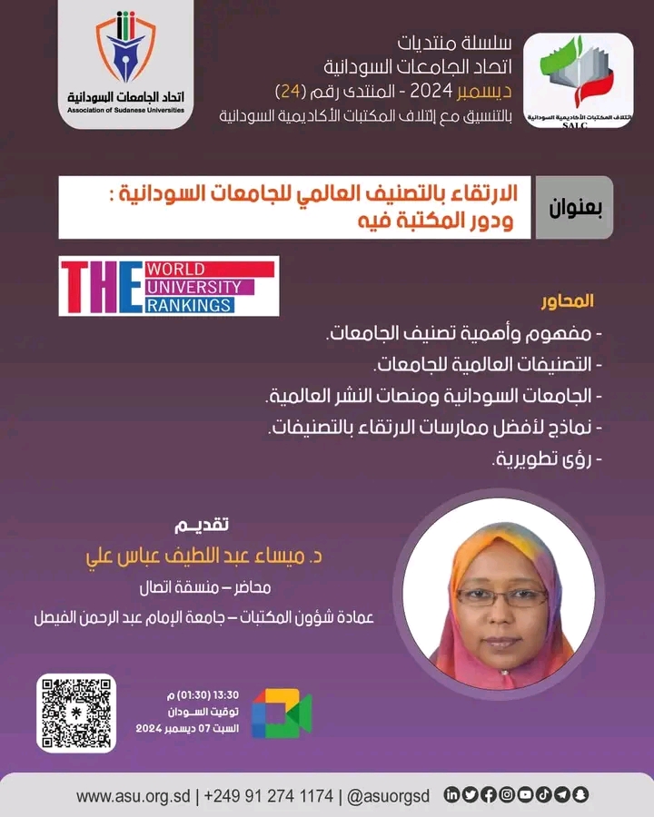 مفهوم وأهمية تصنيف الجامعات. التصنيفات العالمية للجامعات. الجامعات السودانية ومنصات النشر العالمية. نماذج لأفضل ممارسات الارتقاء بالتصنيفات.. رؤي تطويرية.
