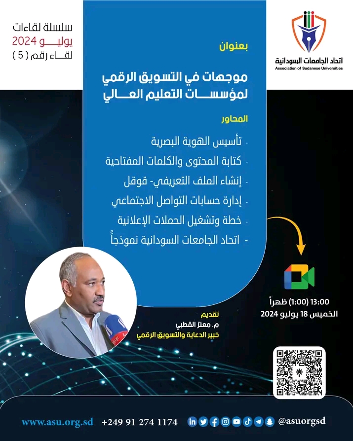 تأسيس الهوية البصرية كتابة المحتوي والكلمات المفتاحية انشاء الملف التعريفي google. ادارة حسابات التواصل الاجتماعي اتحاد الجامعات السودانية نموذجا. خطة وتشغيل الحملات الاعلانية.